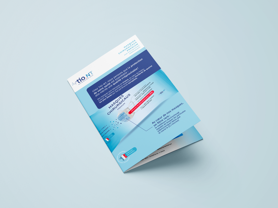 Tio-nt fabrique des masques chirurgicaux premium à haute capacité de filtration. Le packaging reprend l'identité de la filtration par le dégradé, les couleurs. Le packaging permet de voir également la texture du masque grâce à une fenêtre transparente pour voir la qualité de ceux-ci.